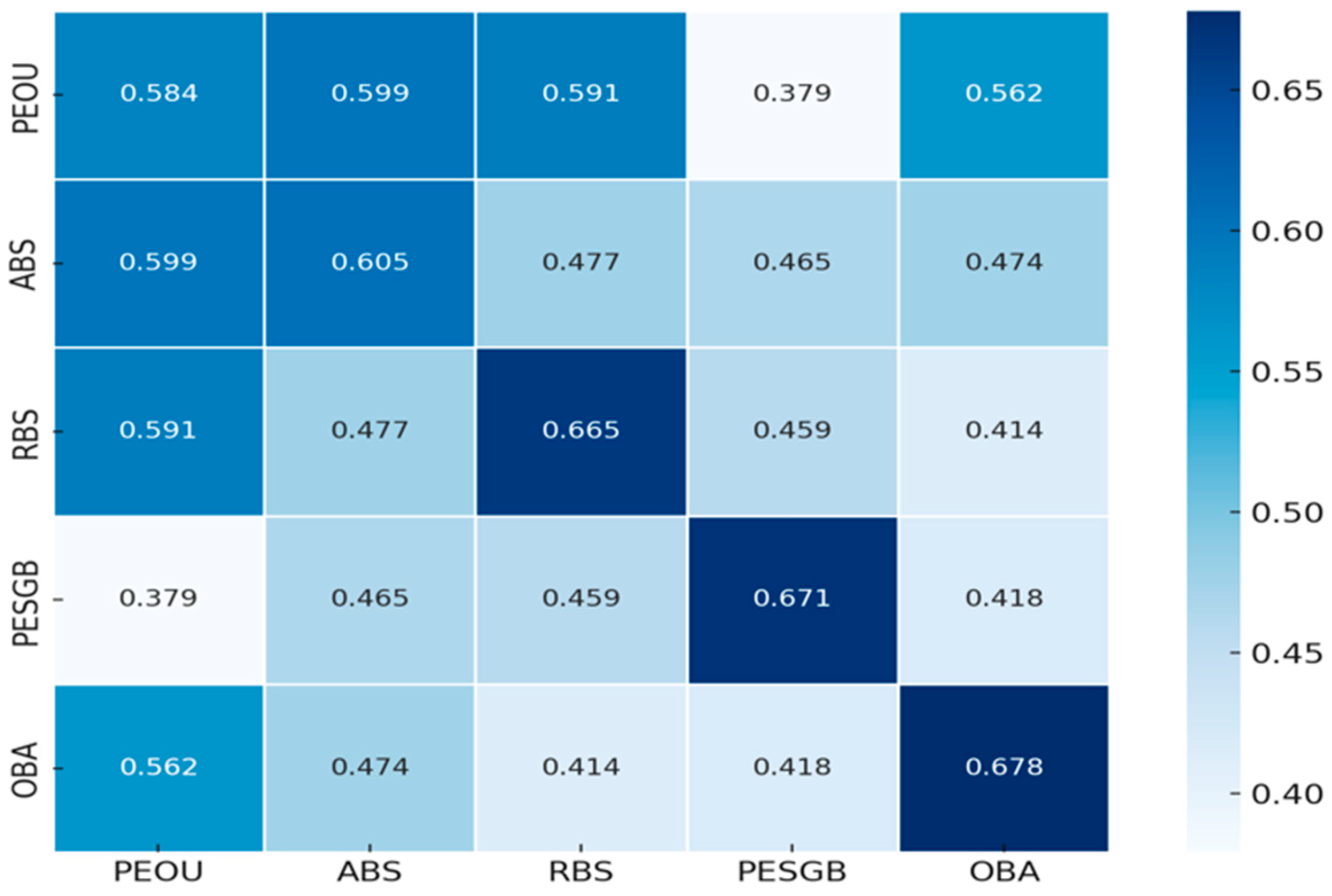 | PEOU | ABS | RBS | PESGB | OBA | AVE | CR | |
