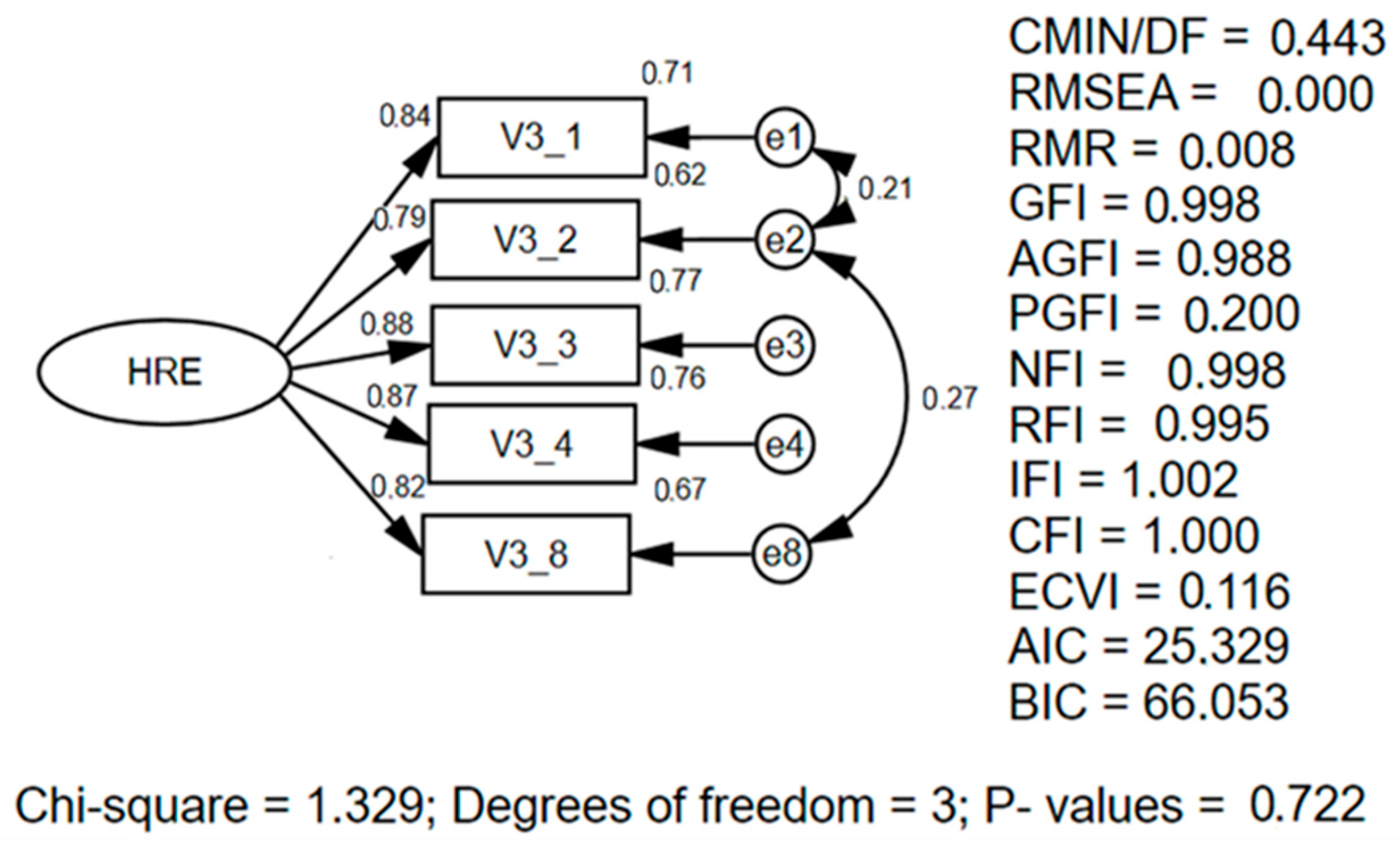 | V1_3 <--- EI 0.870 | V1_6 <-- EI 0.832 | V2_3 <-- SL 0.816 | V2_7 <-- SL 0.916 | V3_3 <-- HRE 0.822 | V3_3 <-- HRE 0.875 |
