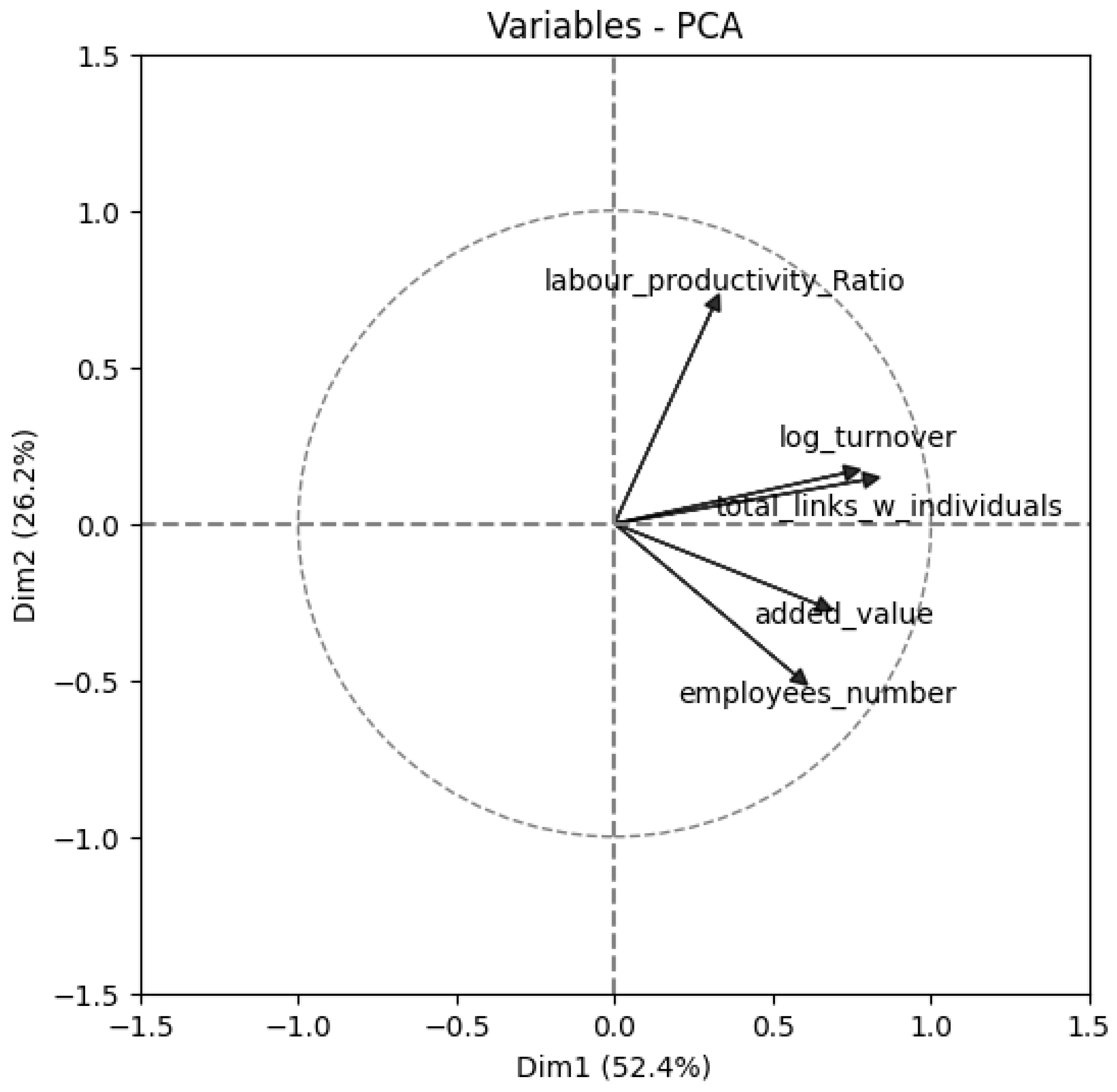 | 5 | For clarity, the first three variables correspond to the ones illustrated in Section 3.1, respectively named “added value rate”, “number of employees” and “labour productivity rate”. The fourth indicator, more specifically, represents the number of social connections—both direct and indirect—that a firm’s executives have with other individuals. In detail, direct links capture formal relationships, such as shared positions or board memberships, while indirect links arise through connections with other executives who hold roles in common firms. The aggregate count of these links, adjusted for duplicates, provides a proxy for the firm’s managerial network density, reflecting its level of integration within the national professional and decision-making landscape. |