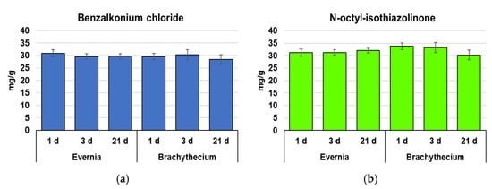 Concentration (mean ± standard error) of benzalkonium chloride (a) and n-octyl-isothiazolinone (b) in samples of Evernia and Brachythecium after 1, 3, and 21 days from exposure with Biotin T and Preventol RI80. Statistically significant differences (p < 0.05) did not emerge either over time or between species.