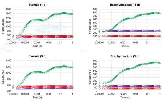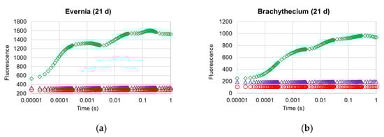 Compared with control samples, Biotin R and Preventol RI80 caused a strong impairment of the photosynthetic apparatus in both the lichen and the moss (Table 1). After 1 day, Evernia showed a mean decline in chlorophyll content and normalized difference vegetation index (NDVI) of 43% and 28%, respectively, while Brachythecium showed 74% and 41%, respectively. In both species, chlorophyll a fluorescence parameters were already almost zeroed after 1 day, as clearly shown by the analysis of the OJIP transient profiles (Figure 2), which showed that very strong damage occurred at the photosynthetic apparatus of both organisms, with treated samples showing the complete loss of their OJIP step profile, irrespective of treatment. As a matter of fact, here we present only the data of one parameter, the common indicator of photosynthetic efficiency FV/FM, which is widely used to obtain functional information of the photosynthetic apparatus following biocidal treatments [,,,,]. After 3 days, both Evernia and Brachythecium showed further reductions in the content of chlorophyll, except for the Brachythecium treated with Preventol RI80. NDVI was unchanged, with only the exception of Brachythecium treated with Biotin T. After 21 days, both biocides caused a zeroing of the chlorophyll content and a further reduction of NDVI compared with control samples of ca. 52.5% for Evernia and 75% for Brachythecium.