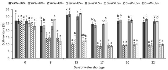 The overall soil temperature ranged from 22.6 ± 2.9 °C to 23.7 ± 3.6 °C (mean, 22.9 °C; n = 516). During the day, soil temperature ranged from 23.0 ± 3.0 °C to 24.4 ± 4.0 °C (mean, 23.4 °C; n = 307), while during the night, soil temperatures were a bit lower, ranging from 22.0 ± 2.5 °C to 23.6 ± 3.1 °C (mean, 22.5 °C; n = 258). The highest measured values, which were somewhat higher compared to those from all the other treatments, were measured for the Si+W–UV+ treatment. Soil moisture did not differ significantly between the treatments before water shortage, while during water shortage, the difference in soil moisture between the W+ treatments (i.e., Si+W+UV+, Si+W+UV–, Si–W+UV+, Si–W+UV–) and the W– treatments (i.e., Si+W–UV+, Si+W–UV–, Si–W–UV+, Si–W–UV–) was pronounced and significant (p ≤ 0.05; Figure 1). The overall soil moisture during water shortage ranged from 12.0 ± 3.3% to 13.1 ± 4.5% in the four treatments with reduced water availability (mean, 12.7%), and from 25.4 ± 3.4% to 27.1 ± 3.1% in the four treatments with sufficient water availability (mean, 26.0%; n = 25).