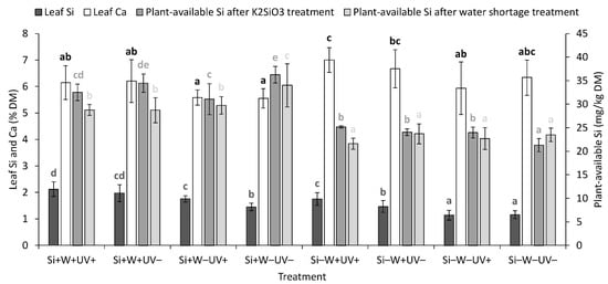The effect of water availability on Si uptake was also shown in the present study. The leaf Si content increased with K2SiO3 addition and was negatively affected by water shortage and reduced UV radiation. The main reason for the latter effect might be the increased water-use efficiency (WUE) in the UV-treated plants and the synergistic effect of UV radiation and drought. In soybean cultivars, Gitz III et al. [] reported about a positive relationship between UV-B levels and WUE. Similarly, it was shown for different cultivars of spring wheat that WUE significantly increased under the combined conditions of UV-B and water stress []. Contrary to the leaf Si content, the leaf Ca content significantly decreased with K2SiO3 addition. This negative relation between Si and Ca was already shown in previous studies []. The level of plant-available Si in the soil after K2SiO3 treatment was significantly affected by the interaction between K2SiO3 addition and ambient UV radiation, and also by the interaction of all the three studied factors. This was possibly the consequence of the impact of the three factors on plant water management [,,]. The analysis comprising effects of K2SiO3 addition, water availability, and ambient UV radiation showed no significant impact of K2SiO3 addition on leaf K, S, P, and Cl contents, which might be the result of the species-specific strategies in uptake of different elements []. The study of Greger et al. [], which examined various species, showed that Si addition increased the availability of Ca, P, S, Cl, and some other elements.