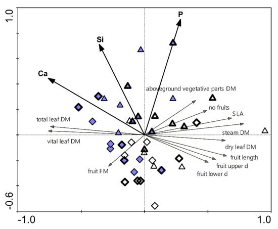 The biomass of the aboveground vegetative parts was strongly positively related to soil moisture during water shortage and with potential photochemical efficiency. The leaf Si content positively affected the vital leaf biomass, while it was negatively related to leaf chlorophyll a and b contents. This relation with biomass is also evident from the RDA. Si accumulation in plants does not only mitigate different stresses [], but it also interferes with different carbon compounds; thus, it may positively affect plant economy and production []. The RDA run with leaf element contents showed that leaf Ca, Si, and P contents played a significant role in explaining cucumber growth parameters, which was possibly the consequence of a lack of an impact of the three factors on the other elements in the cucumber leaves, as indicated above. The fruit biomass was positively related to the number of fruits. The lowest values were obtained under water shortage and ambient UV radiation, with no respect to Si. Besides water shortage, this effect was presumably also due to UV-B radiation, since previous research showed that the UV-A radiation pre-treatment increased the quality of cucumber seedlings for greenhouse production and did not exert any negative impacts on fruits [].