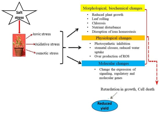 The excessive salinity in the rhizospheric zones can negatively affect growth and productivity through creating an imbalance in the cytoplasmic ion homeostasis and thereby impacting metabolic dysfunction and other major biochemical and physiological processes [,]. Varied reactive oxygen species (ROS) generated at higher level can occur due to salinity stress in plant cells, can act as signaling molecules, and help in mediating numerous key physiological processes []. However, overproduced or non-metabolized ROS can be toxic to plants and cause oxidative damage to cellular constituents including macromolecules (DNA, lipid, and proteins), and, eventually, cause cell death [,].