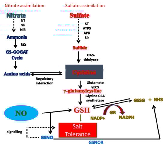 The NO generation and assimilation of N are closely connected. Both the amount and also the form of the supplied N (i.e., NO3− or/NH4+) affect levels of NO in plants []. Nitrite (NO2−) and arginine are the main substrates for NO synthesis. Plants were reported to optimize the use of nitrite as a main source for NO []. NO-regimes were reported to exaggerate the activity NR, a key enzyme in N-metabolism, and a NO-source []. NO was also argued to modulate the uptake and distribution systems of N []. In addition to its role in N assimilation and uptake, involvement of NO in nitrate-sensing pathway was also reported in plants []. The reaction of NO with GSH produces GSNO, a low-molecular-weight S-nitrosothiol (SNO). Notably, more stable than NO, SNO serves as a mobile reservoir of NO. However, GSH content can also regulate plant’s S-status through induced S assimilation and forms GSNO [,]. The coordination of NO with S can maintain ionic and redox homeostasis, strengthen the plant antioxidant machinery, and thereby improve photosynthetic performance, growth, and salt tolerance []. Figure 2 summarizes N and S assimilation and how their coordination with NO helps in salt tolerance in plants.