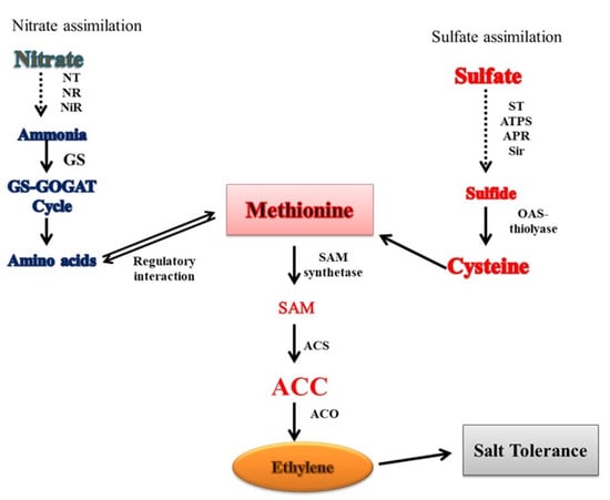 Regulatory interaction between nitrogen (N) and sulfur (S) assimilation and ethylene (ETH) biosynthesis linked with salt stress tolerance. ACC, 1-amino cyclopropane carboxylic acid synthase; ACO, 1-amino cyclopropane carboxylic acid oxidase; APR, adenosine 5′phosphosulfate reductase; ATP-S, ATP sulfurylase; GS, glutamine synthetase; NR, nitrate reductase; NiR, nitrite reductase; NT, nitrate transporter; ST, sulfate transporter; SiR, sulfite reductase; OAS-TL, O-acetylserine (thiol)lyase; SAM, S-adenosyl methionine.