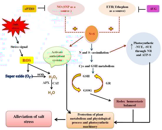 The review emphasizes that salt-induced consequences in plants are primarily due to the excess overproduction of ROS resulting in disturbance in plant metabolism and eventually loss of photosynthetic productivity. The appraisal of the studies conducted has shown that plants execute various mechanisms as possible defense strategies to respond the adverse stress conditions. The management of mineral nutrients N or S-mediated regulation serves as a major determinant for depicting salt stress tolerance. Assimilation of N or S leads to the synthesis of Cys that serves as a precursor for the synthesis of a tripeptide GSH which plays a key role in the protection of plants against salt stress. Additionally, the supplementation of N and S and exogenously applied phytohormones prove beneficial for the physiology and metabolism of plants under salt stress, by regulating various metabolic processes as a function of antioxidative defense enzymes. Antioxidants defense system has a constructive function in controlling salt stress in scavenging ROS. Enhanced level of antioxidants enzymes in plants may provide a shield against salt stress through molecular approaches. The literature discussed provides insight on the effects of phytohormones signaling on the regulation of N and S assimilation, GSH synthesis, physiological processes, and productivity of crop species under abiotic stress in general and salt stress in picky. Moreover, diverse studies illustrate the involvement of NO and ETH in providing protection against various environmental stresses, only meager studies discuss the interaction of NO and ETH with N and S with respect to the salt stress. This review also presented a critical crosstalk on NO/ETH, assimilation of N and S, and salt stress (Figure 4).