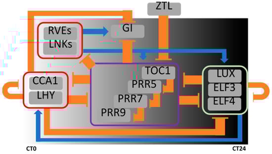 Plant circadian clock. Core components of the circadian oscillator in A. thaliana and its regulatory loops network. The position in the chart of each component is relative to the time of maximal expression/activity along the day. CT: circadian time (CT0 is defined as the light on-set). Blue lines indicate activation and orange lines indicate repression. Purple box: PRRs components (PRR9, PRR7, PRR5 and TOC1). Green box: evening complex “EC” members (LUX, ELF3 and ELF4). Red box morning elements: CCA1/LHY and RVEs/LNKs. This is a simplified scheme and it does not include all of the oscillator components. LHY: LATE ELONGATED HYPOCOTYL; CCA1: CIRCADIAN CLOCK ASSOCIATED1; RVE: REVEILLE; LNK: NIGHT LIGHT-INDUCIBLE AND CLOCK-REGULATED; PPR: PSEUDO RESPONSE REGULATOR; TOC1: TIMING OF CAB EXPRESSION1; ZTL: ZEITLUPE; GI: GIGANTEA; ELF3/4: EARLY FLOWERING 3/4; LUX: LUX ARRHYTHMO.