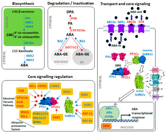 Abscisic acid (ABA) machinery. Biosynthesis: ABA is synthesized from β-carotene (C40) through the carotenoid pathway. Steps from β-carotene (C40) to xanthoxin (C15) take place in plastids. In the cytoplasm, ABA2 and ABA3 convert xanthoxin into active ABA. Conversion of 9′-cis-neoxanthin and 9′-cis-violaxanthin to xanthoxin by NCEDs is a rate-limiting step in ABA biosynthesis. Degradation/Inactivation: active ABA level is regulated by catabolism through both ABA conjugation and catalytic hydroxylation. ABA can be glycosylated into inactive ABA-GE by UGT71C5. On the other hand, AtBG1 and AtBG2 can modify ABA-GE to produce active ABA. Further, ABA can be catalyzed to phaseic acid (PA) by CYP707As, which in turn is catalyzed to dihydrophaseic acid (DPA) by PA reductase (PAR). Transport and Core Signaling: ABA transport is carried out by ABCGs, NPFs and DTX transporters. Inside the cell, ABA is perceived by PYR/PYL/RCAR receptors, either at cytosol or nucleus, forming a stable ternary complex with clade A PP2Cs. The formation of this complex allows the activation of SnRK2s that leads to ABA-induced regulation of plasma membrane and nuclear targets (i.e., NADPH oxidase, KAT1, SLAC1, and ABFs/AREBs). Core Signaling Regulation: PYLs receptors, PP2Cs and SnRK2s are regulated by several protein kinases. The degradation of ABA signaling core components is regulated both by the ubiquitin-proteasome system, and through the endosomal-vacuole pathways. Components and arrows in blue mean positive function on the final ABA response, while red components and red arrows mean a negative effect. Pointed arrow: activation; rounded arrow: inactivation. (For more information about these components see Table S1).