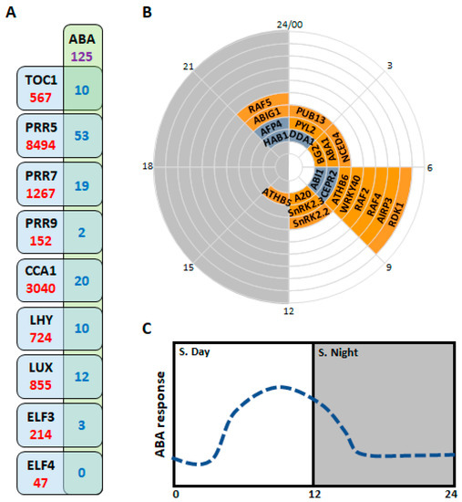 Connections between Circadian Clock and ABA machinery. (A) Circadian clock components interact with the promoter of different ABA machinery genes. Data extracted from RNAseq experiments found in literature from A. thaliana. In purple: ABA machinery components analyzed in this review (for more information see Table S1); in blue: number of ABA machinery genes regulated by each circadian transcription factor; in red: number of genes potentially regulated by each transcription factor. (B) Phase plot or wind-rose of gene expression time of ABA machinery components. Components with circadian oscillation only plotted. The name of each component appears in the graph at the time of acrophase (maximum of gene expression). Expression data was extracted from DIURNAL web (http://diurnal.mocklerlab.org/, accessed on 21 December 2021) and obtained from plants (A. thaliana) under constant light conditions (free running). White background, from 0 to 12 h, represents the circadian subjective day, and grey background, from 12 to 24 h, the circadian subjective night. (C) Putative circadian regulated ABA response gating in plants. S. Day: circadian subjective day; S. night: circadian subjective night. 0, 12 and 24: circadian time.