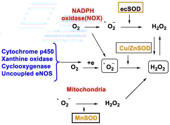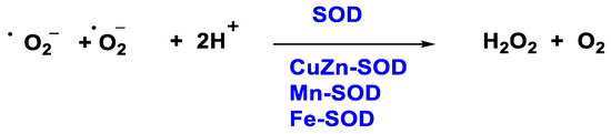 •O2− is also formed in other cell organelles such as the endoplasmic reticulum, peroxisomes, and cytosol [18] and H2O2 production involves the enzyme superoxide dismutase, SOD-1, -2 and -3, Figure 2. In fact, there are enzymatic reactions within the cell that result in the generation of •O2−.