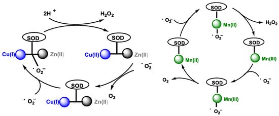 In the catalytic cycle of cytosolic superoxide dismutase Cu/Zn SOD, which contains Cu and Zn in the catalytic site, SOD transforms the •O2− to O2 by reducing Cu(II) to Cu(I) in its active site. Then, another •O2− molecule causes the oxidation of Cu(I) to Cu(II), generating an H2O2 molecule at the end of the cycle. Zinc does not act in the catalytic cycle, it only helps to stabilize the enzyme, Figure 5, left. The catalytic cycle of mitochondrial superoxide dismutase Mn-SOD is similar, except for the use of Mn in the oxidation-reduction reactions, transiting between (Mn(III)) and (Mn(II)) [11], Figure 5, right.