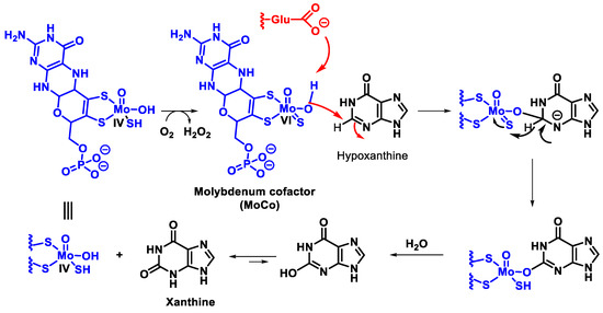 In mammals, this enzyme catalyses the hydroxylation of hypoxanthine to xanthine and xanthine to uric acid [27]. XOR uses hypoxanthine and oxygen (as an electron acceptor) to give rise to xanthine (eventually uric acid) and superoxide radical. In the active form of XOR, Mo forms two single bonds with the sulphur atom (thiol groups), two bonds with the oxygen atom (one with the oxo group and one with the hydroxyl group) and the fifth coordination position is occupied by a double bond with the sulphur atom. XOR converts xanthine to uric acid, Figure 7, the end product of the catabolism of purine bases in humans.