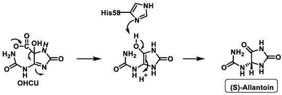 The third enzyme, OHCU decarboxylase, catalyses the de-carboxylation of OHCU, producing (S)-allantoin in a stereospecific manner [33], Figure 11.