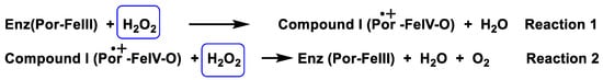 Catalase is an antioxidant enzyme found in most aerobic organisms. It catalyses the dismutation of H2O2 into water and oxygen. Most of these enzymes are homotetramers with a heme group on each subunit. In the catalase reaction, a two-electron transfer occurs between two hydrogen peroxide molecules, one acting as an electron donor and the other as an electron acceptor. The reaction mechanism proceeds in two steps. In the first step, catalase is oxidised by a peroxide molecule to form an intermediate called compound I. Compound I is characterised by a ferroxyl group containing FeIV and a porphyrin cation radical. In this reaction, a water molecule is formed (reaction 1). In the second step of the reaction, compound I is reduced by another peroxide molecule, returning the catalase to its initial state and producing water and dioxygen (reaction 2), Figure 14.