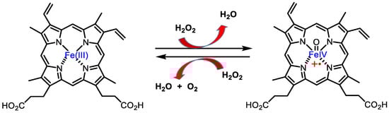 In biological systems, H2O2 can be removed directly by the enzyme CAT, Figure 12, which uses H2O2 to generate molecular oxygen and water, whereas GPx uses H2O2 and reduced glutathione (GSH) to form water and oxidised glutathione GSSG. Fe(II) reacts with H2O2 in a Fenton reaction, producing •OH and OH−. Iron can also react with H2O2 to produce OOH− and H+ [35].