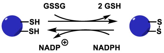 Trx are proteins that act as antioxidants by facilitating the reduction of other proteins through thiol-disulphide exchange on cysteine. Thioredoxin reductase TrxR is responsible for the reduction of Trxox to Trxred and requires NADPH as an electron donor source [46], Figure 19.