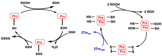 (Left): Catalytic cycle of Prx containing 1 catalytic cysteine (1-Cys-Prx). (Right): Catalytic cycle of typical Prx (2-Cys-Prx).