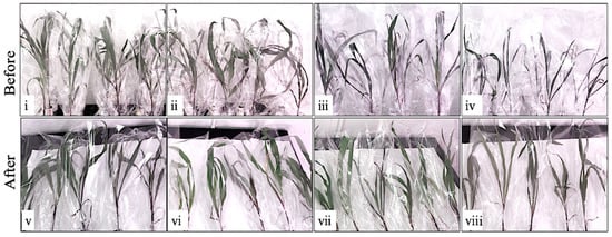 Effect of Dalbulus maidis, drought, and combined stress on the above-ground performance of maize. Images of seedlings exposed to D. maidis, drought, and combined stress treatments: images (i,v) are control, images (ii,vi) are D. maidis-only, images (iii,vii) are drought-only, images (iv,viii) are combined stress (D. maidis and drought stress), images (i–iv) also show the observed drought symptoms (±wilting, leaves rolling) on the 3rd day of absolutely no watering at the 21-day point of progressive stress, while images (v–viii) show recovery 1 day after re-infiltrating the symptomatic seedlings.