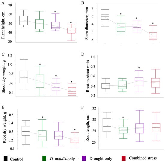 Effects of drought, Dalbulus maidis, and combined stress on drought-tolerant maize hybrids. (A) plant height [Drought F1,1 = 45.579 p, < 0.0001; D. maidis F1,1 = 17.910 p, < 0.0001; drought × D. maidis F1,1 = 1.0660 p, = 0.304], (B) stem diameter [Drought F1,1 = 128.838 p, < 0.0001; D. maidis F1,1 = 137.440 p, < 0.0001; drought × D. maidis F1,1 = 0.456 p, = 0.50], (C) shoot dry weight [Drought: F1,1 = 67.837 p, < 0.0001; D. maidis F1,1 = 16.540 p, < 0.000; drought × D. maidis F1,1 = 0.253 p, = 0.616], (D) root-to-shoot ratio [Drought: F1,1 = 16.708 p, < 0.0001; D. maidis F1,1 = 0.936 p, = 0.336; drought × D. maidis F1,1 = 1.234 p, = 0.269], (E) root dry weight [Drought F1,1 = 16.260 p <0.0001; D. maidis F1,1 = 20.755 p, < 0.0001; drought × D. maidis F1,1 = 0.424 p, = 0.517], and (F) root length [Drought F1,1 = 0.018 p, = 0.895; D. maidis F1,1 = 3.747 p, = 0.056; drought × D. maidis F1,1 = 5.283 p, = 0.024]. Treatment groups are ordered from left to right by control, D. maidis-only, drought-only, and combined stress treatments. Asterisks indicate significant differences between control and treated seedlings per Dunnett’s tests (statistics are shown in Table 1). Box plots represents mean values from all three drought-tolerant hybrids (LH195 × TX772, LH195 × TX773, and TX790 × TX777).
