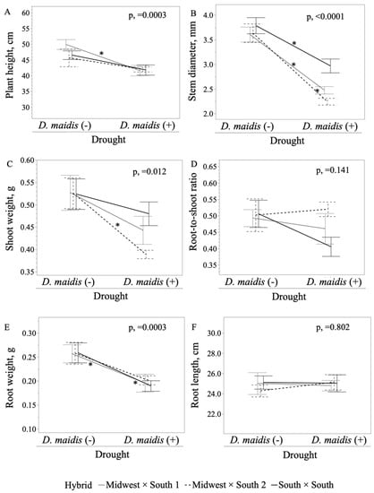 Effects of Dalbulus maidis on drought responses of maize hybrids (Midwest × South 1, Midwest × South 2 and South × South). (A) plant height (F8,8 = 0.537 p, = 0.825), (B) stem diameter (F8,8 = 0.939 p, = 0.488), (C) shoot weight (F8,8 = 0.531 p, = 0.831), (D) root-to-shoot ratio (F8,8 = 1.710 p, = 0.104), (E) root weight (F8,8 = 1.127 p, = 0.351), and (F) root length (F8,8 = 0.873 p, = 0.542) for the nested term Hybrid [Drought, D. maidis]. Asterisks indicate significant differences by a priori contrast between drought-only and combined stress treatments with critical p, ≤ 0.017, per Bonferroni correction. On the x-axes, (−/+) indicates absence/presence of D. maidis during drought stress.