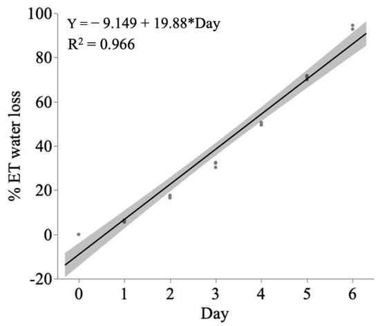 Establishing water infiltration regime for inducing drought stress. Drought induction water regime was determined by assessing the relationship between evapotranspiration rate against day in maize hybrids using linear regression analysis. Days taken to reach 50% ET water loss was determined by the equation of the line (Y = −9.149 + 15.88 × Day) and calculated to be ≅4 days (=3.7 days). Additionally, watering at 2-day intervals would keep ET water loss within the desired ranges 0–30% (=23% ET water loss). The shaded region shows the 95% confidence of the fitted line, which is the daily ET water loss for the mean of three hybrids (Midwest × South 1, Midwest × South 2, and South × South). There was no significant difference in the mean lines for each hybrid (not shown, n = 21, F2,2 0.014, p = 0.986).