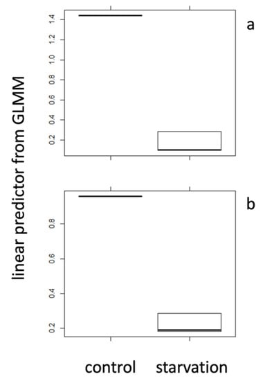 Responses of starvation stress markers within the positive control experiment. Glucose haemolymph titre (a) and trehalose haemolymph titre (b) are shown for stressed (N = 30) and control bees (N = 10). The y-axis shows the linear predictor for the response variable derived from a GLMM controlling for pseudo-replication due to common cages.