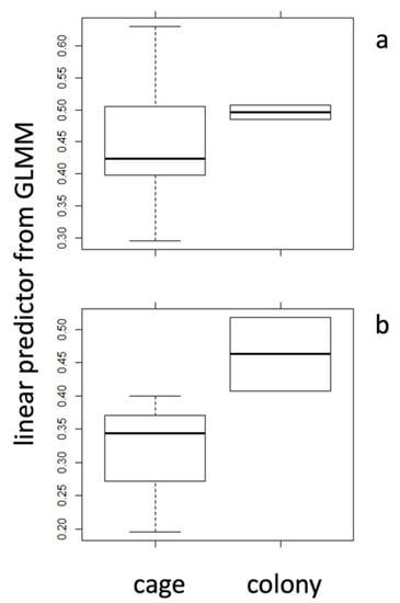 Responses of stress markers for a comparison between all caged bees and bees originating from the natural colony environment. Glucose haemolymph titre (a) and trehalose haemolymph titre (b) are shown for caged (N = 128) and colony bees (N = 20) in the form of the linear predictor for the response variable derived from a GLMM controlling for pseudo-replication due to common cages and replicate trials.