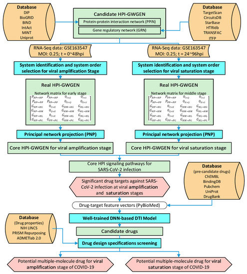 In this study, we first employed the systems biology method via host–pathogen–interactive (HPI) RNA-seq time profile data to investigate the pathogenesis of COVID-19 in order to identify significant biomarkers as drug targets and treat the SARS-CoV-2 infection at the amplification and saturation stages. Recently, a deep neural network (DNN)-based DTI model that targets proteins to significantly improve the prediction of DTI compared to conventional DTI models has been introduced by a deep learning algorithm through the feature vectors of molecular drugs [28,29]. Therefore, a DNN-based DTI model was trained by DTI databases [30,31,32,33,34] to efficiently predict candidate molecular drugs for each significant biomarker (drug target) of the amplification and saturation stages of SARS-CoV-2 infection. Then, based on drug design specifications, in order to prune some candidate drugs, a set of candidate molecular drugs combined as a multiple-molecule drug was proposed as a potential combination therapy to target these significant biomarkers at the amplification and saturation stages to disrupt the progression of SARS-CoV-2 infection. Therefore, the systematic procedure of repositioning a multiple-molecule drug for disrupting the progression of SARS-CoV-2 infection by utilizing the systems biology method through HPI RNA-seq data and DNN-based DTI model with drug design specifications are described as follows: (1) constructing the candidate HPI genome-wide genetic and epigenetic network (HPI-GWGEN) using big data mining from databases [35,36,37,38,39,40,41,42,43,44,45,46]; (2) system identification and system order selection to eliminate the false positives in the candidate HPI-GWGEN to obtain the real HPI-GWGEN using the system models and HPI RNA-seq time profile data; (3) applying the principal network projection (PNP) method to construct the core HPI-GWGEN and obtain the core HPI signaling pathways and their abnormal downstream cellular functions of SARS-CoV-2 infection using annotations of the Kyoto Encyclopedia of Genes and Genomes (KEGG) pathways [47,48]; (4) investigating and comparing the pathogenic mechanisms between the amplification and saturation stages of SARS-CoV-2 infection to identify significant biomarkers as drug targets against SARS-CoV-2 infection at the amplification and saturation stages; and (5) predicting the candidate drugs for significant biomarkers using a DNN-based DTI model and selecting potential multiple-molecule drugs for the therapeutic treatment of the amplification and saturation stages of SARS-CoV-2 infection with three drug design specifications, i.e., regulation ability, toxicity, and sensitivity. We finally proposed the combination of bosutinib, erlotinib, and 17-beta-estradiol as a multiple-molecule drug for the treatment of the amplification stage of SARS-CoV-2 infection and the combination of erlotinib, 17-beta-estradiol, and sertraline as a multiple-molecule drug for the treatment of the saturation stage of mild-to-moderate SARS-CoV-2 infection.