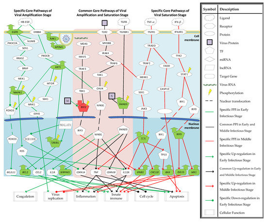 With the help of the enrichment analysis of KEGG and the exiting literature, the core host–pathogen interactive signaling pathways and their downstream abnormal cellular functions of SARS-CoV-2 infection at the amplification and saturation stages are shown in Figure 3. The core signaling pathways with red background in the middle of Figure 3 are common between the amplification and saturation stages of SARS-CoV-2 infection; the specific signaling pathways on the left-hand-side are the amplification stage of SARS-CoV-2 infection; and the specific signaling pathways on the right-hand-side are the saturation stage of SARS-CoV-2 infection.