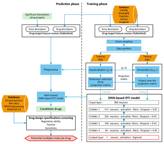 After investigating the core HPI signaling pathways and their downstream abnormal cellular functions for SARS-CoV-2 infection at the amplification and saturation stages in the above subsection, we finally chose EGFR, AKT1, IFNB1, and SMAD3 as the drug targets for the amplification stage of SARS-CoV-2 infection and picked IFNB1, SMAD3, and JUN as the drug targets for saturation stage of SARS-CoV-2 infection. The purpose of drug targets for the amplification infectious stage is mostly to reduce the interferences of the host cell by SARS-CoV-2. The drug target JUN for therapy in the saturation infectious stage is to shorten the course of the SARS-CoV-2 infection by reducing the virus’s replication. Subsequently, the DNN-based DTI model is constructed and trained by DTI databases to predict the candidate repurposing drugs that target these significant biomarkers (drug targets). Finally, the potential multiple-molecule drug is proposed for SARS-CoV-2 infection by screening the candidate repurposing drugs with three drug design specifications. The architecture of the DNN-based DTI model for DTI prediction is shown in Figure 4.