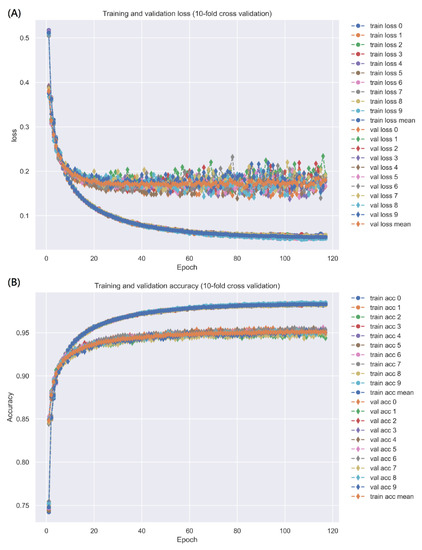 The training and validation loss is represented in (A), and the training and validation accuracy is represented in (B). The early stop is adopted to avoid overfitting to stop at epoch = 117.