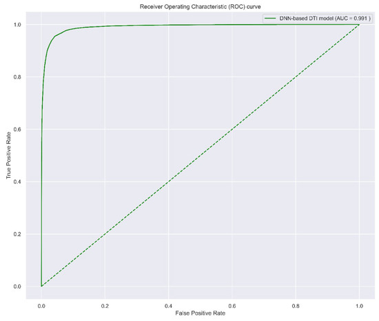 The ROC curve of DNN-based DTI model. The higher AUC value indicates the higher ability to distinguish positive and negative interaction. The worst case (AUC = 0.5) is shown with the dotted line, which implies the model predicts the positive and negative randomly.