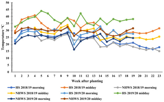 Weekly temperature records for HS and NHWS environments for the two seasons of plantings.