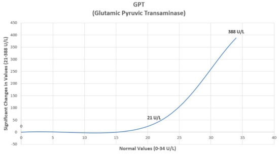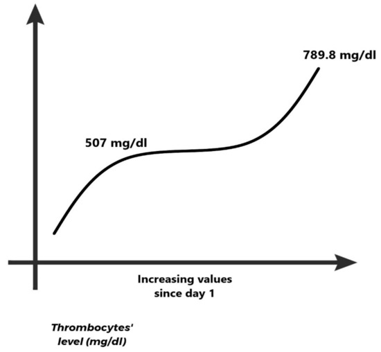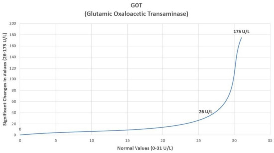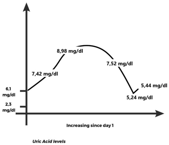 In Table 1, we can follow the changes in the laboratory values under the proposed treatment during hospitalization, and we must mention here that Allopurinol was administered only for the first five days. In the figures, we can better see how uric acid normalized (Figure 1), and the liver (Figure 2 and Figure 3) and inflammatory tests (Figure 4 and Figure 5) increased, the latter at a lower speed after administering Allopurinol.