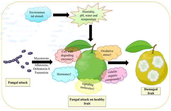 By secreting effector proteins, fungi that are biotrophs feed on live cells and weaken the immunological response of their hosts. On the other hand, necrotrophic fungi, also called saprotrophic fungi, have the ability to trigger necrosis and consume the dead cells of the host []. Disease signs appear in fruits that have been infected with postharvest fungal infections both after harvest and generally during storage. After harvest, fungi spread and penetrate the host cuticle to access the fruit [,]. For this to happen, the fruit cuticle must be damaged, and the invader must enter through natural host perforations and wounds []. The fungus frequently stays latent and restricted to the introduction site when those particularly sneaky infections come into touch with immature fruit. They remain hidden from visible inspection until the harvested fruit ripens, which takes months []. Numerous fungi have been found to remain dormant in their hosts until the fruits develop, including Alternaria, Botrytis, Colletotrichum, Penicillium, Rhizopus, and Monilinia, (Table 1). As the fruit ripens, postharvest fungal infections grow more active. The fungi are necrotrophs at this aggressive stage, which means that they destroy the host cell and absorb its nutrition to cause deterioration and degraded fruit tissue []. However, those fungi survive in a number of ways before reaching this lethal stage. Before the fruit ripens, several fungi, including Alternaria, Colletotrichum, Lasiodiplodia, Phomopsis, and others, begin to cause stem-end rot and colonize the stem end by living an endophytic existence []. Fungi, such as Colletotrichum, are categorized as hemibiotrophic since they can exist in unripe fruit cells as biotrophs without harming them []. Botrytis cinerea causes grey mold disease in numerous fruit species and varieties []. Numerous fungi, including Lasiodiplodia pseudotheobromae, Botryosphaeria dothidea, and Neofusicoccum parvum causes fungal infection in guava, avocado, and persimmon fruit, respectively []. Figure 1 demonstrates how fungi Aspergillus spp. infect the guava fruit by secreting mycotoxins (Aflatoxins, Ochratoxin A, and fumonisin) [] that lead to the elevation of cell wall degradation enzymes, oxidative stress, volatile organic acid, and hormones that damages the fruit.
