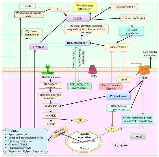 Fungal infection and signaling mechanism of fruit. On the surface of these spores, several signaling pathways are linked by proteins such as multiprotein complexes, signal transduction systems, receptor tyrosine kinases (RTKs), and G protein–coupled receptors (GPCRs), which are employed to sense environmental and host fruit stimuli. The primary signaling pathways involved in fruit fungal infection include MAPK, cAMP, and protein kinases that causes the activation of TF. These TFs trigger several cell signaling pathways. Similar to fruits cell the toxins produce by these pathway causes oxidative burst by producing ROS, activation on CWHEs, production of organic acid, volatile acid compound, and increases the synthesis of glucose that leads to tissue softening and damages fruit. Figure created with BioRender.com (https://app.biorender.com/biorender-templates)—accessed on 25 November 2022.