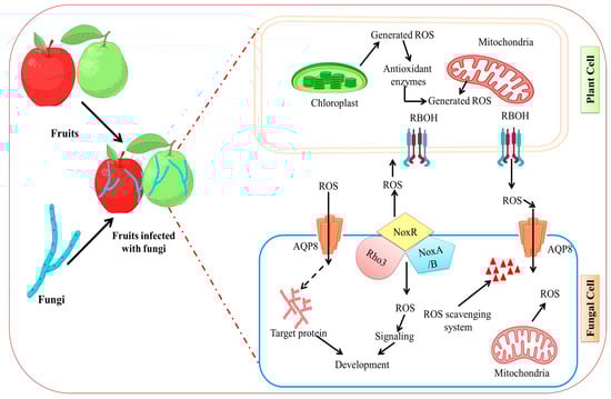 Fungal infection induced ROS generation in fruit. ROS signaling in fungal infections’ interactions with their plant hosts. In response to pathogen detection, plant cells release ROS via RBOHs in the plasma membrane and several intracellular organelles. Fungal hyphae generate ROS via Nox complexes, which are primarily found at the plasma membrane or endoplasmic reticulums and stimulate an oxidative burst response within the pathogen. Scavenging systems, which include both enzymatic and non-enzymatic systems, work together to maintain intra and extracellular redox homeostasis in both plants and pathogens. Figure created with BioRender.com (https://app.biorender.com/biorender-templates)—accessed on 25 November 2022.