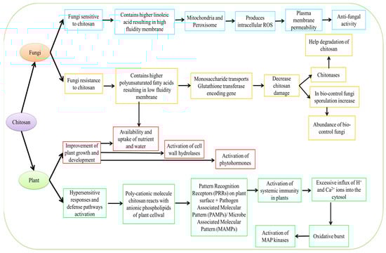 In Rhizopus stolonifera, high CS concentrations can lead to fast potassium efflux, which lowers H+-ATPase, accumulating protons inside the cell and altering the H+/K+ exchange transit across the membrane negatively []. The mechanism of action of CS has been excellently elucidated in Figure 4. The lowest disease incidence (10.08%) was obtained by the researcher after 90 DAT (days after treatment) using a combination CS treatment (1% seed treatment + 0.5% foliar spray) []. As a result, ROS are generated, which causes cell death []. Chitosan largely increased plasma membrane, oxidoreductase, and transport activity, according to RNAseq data and gene ontology (GO) analysis []. Additionally, CS enhances oxidative metabolism, respiration, and GO transport activities in the model yeast plasma membrane. The cell wall integrity genes and stress response in Saccharomyces cerevisiae have also been demonstrated to be induced by CS [].