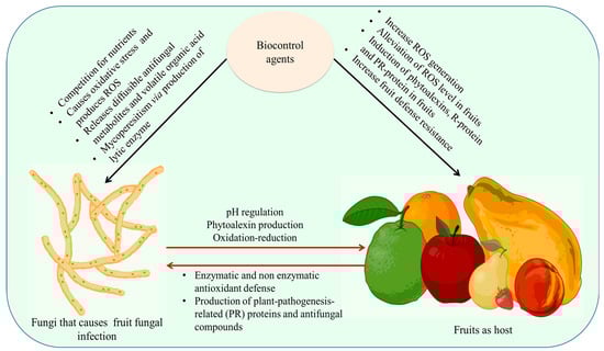Mechanism of biocontrol mechanism in fruit and pathogen. The biocontrol agents affect fungal pathogens by causing oxidative stress that triggers ROS, releases diffusible antifungal metabolites and volatile organic acid and Mycoperesitism via the production of lytic enzyme. In fruits, increase ROS generation, induction of phytoalexins, R-protein, and PR-protein in fruits led to an increase in fruit defense resistance by antioxidant enzymes. Figure created with BioRender.com (https://app.biorender.com/biorender-templates)—accessed on 25 November 2022.