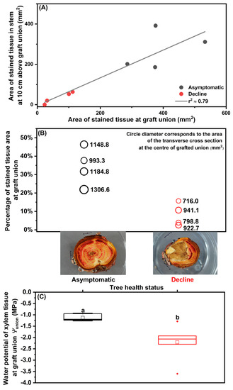 The hydraulic characteristics of asymptomatic and severely declining ‘Salish’/M.9 apple trees sampled from Site A in September 2019: (A) The area of Safranin-O stained tissue in scion cross section at 10 cm above graft union and at the center of graft union (n = 4); (B) The cross section area and the percentage of stained tissue area to the total cross section area at the center of graft union (n = 4); (C) Xylem water potential of graft union (Ψunion, n = 6; one-way ANOVA, Tukey’s test, p ≤ 0.05). In (A), linear regression is shown as solid line; r2 refers to the coefficient of determination for correlation. In (C), horizontal lines of boxplots show median and interquartile ranges, dots show outliners and squares stand for mean.