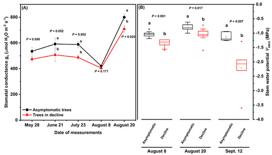 Stomatal conductance gs (A) and mid-day stem water potential Ψstem (B) of asymptomatic and declining ‘Ambrosia’/M.9 apple trees at Site S in the growing season of 2019. Different letters stand for significant difference at p = 0.05 between asymptomatic and declining trees on each date (n = 6; p values from one-way ANOVA with tree heath status as the fixed effect are noted for each pair of comparison, Tukey’s test). In (A), dots with error bars are means ± standard errors. In (B), horizontal lines show median and interquartile ranges, dots show outliners and squares stand for mean.