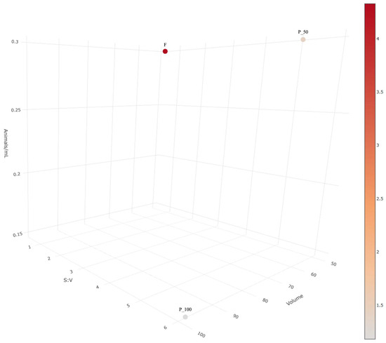 The impact of S:V, volume, and animals/mL on the toxicity of silver nanoparticle ink. EC50 values are expressed in μL/L in the color scale. An interactive version is provided in Supplementary Materials.