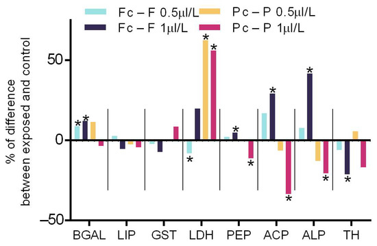 The impact of silver nano-ink in enzyme activity in relation to S:V difference. The data represent the percentage of difference in the enzyme activity of daphnids exposed to silver nano-ink compared to their unexposed control (N = 4). The Mann Whitney U test (*) denotes significant differences between the two conditions. Abbreviations: Fc: falcon control, F: falcon exposed, Pc: Petri control, P: Petri exposed, BGAL: β-galactosidase, LIP: lipase, GST: glutathione-S-transferase, LDH: lactate dehydrogenase, PEP: peptidase, ACP: acidic phosphatase, ALP: alkaline phosphatase, TH: reduced thiols.