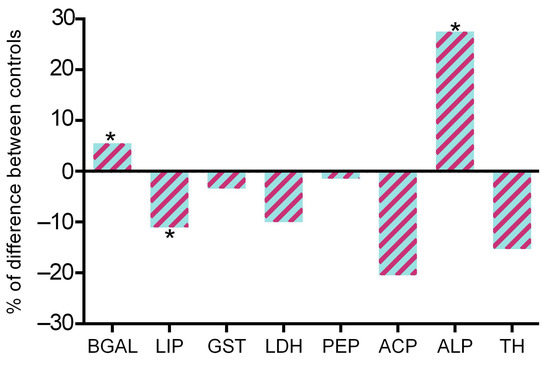 The impact of S:V on daphnids in the absence of silver nano-ink was assessed using an array of biochemical assays to compare the two control conditions (Figure 3). The unexposed controls for the Petri resulted in statistically significant changes in the activity of BGAL (+5.55%), LIP (−11.1%), and ALP (+27.6%), and a non-statistically significant decreasing trend for LDH, ACP, and reduced thiols compared to the control in the falcon tubes.