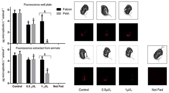 Carboxy microplastics (L3030, Sigma Aldrich, St. Louis, MO, USA) were used in this study to assess the ingestion (feeding) rate of daphnids. These microplastics were tested initially using 1-day-old neonates as they are more sensitive, and no toxicity was recorded for up to 10 h of exposure to microplastics. The concentrations used for this assessment ranged up to 52 mg/L; however, for the feeding assay, a concentration of 13 mg/L was used. The fluorescence from microparticles was measured as Ex/Em 560/590 nm using a TECAN plate reader (Männedorf, Switzerland). The ingested microparticles were measured twice, first as fluorescence in the media during the feeding assay, and the fluorescence difference in the media from the initial time of incubation was converted to the amount of ingested microplastic using a standard curve and expressed per animal. Then, the feeding rate of daphnids was measured after 30 min from the ingested carboxy microplastics following the homogenization of animals and the extraction of microparticles in 0.5 mL of ddH2O. The ingestion of microparticles was also confirmed with fluorescence microscopy using the TRITC filter (Nikon Eclipse TS100). A separate pool of animals was incubated in the absence of microplastic as a negative control for any animal background fluorescence.