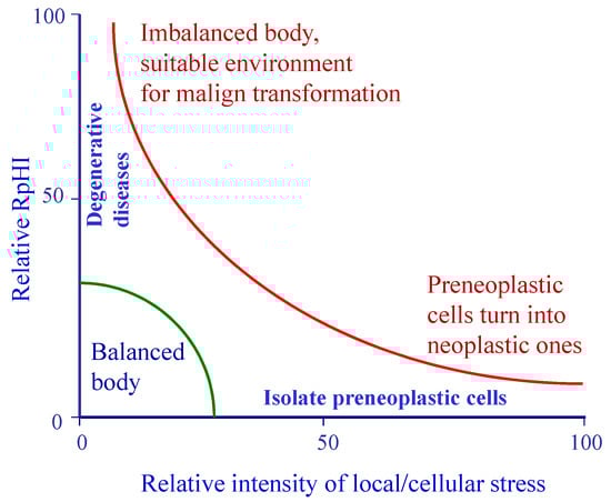 In principle, RpHI can be regarded as a physiological reaction against any stress agents, and if the stressors are strong, an oxygen crisis within the body occurs, the busiest cells divide faster and faster, producing first preneoplastic cells and, in time, malignant tumours. The tumours acquired in this way, as well as their fermentation products, may disturb the normal functions of most cells and tissues in the body [223].