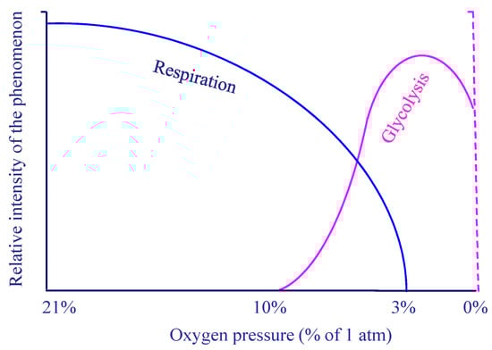 Schematic presentation of the relative intensities of cellular respiration and glycolysis as a function of oxygen partial pressure [103].
