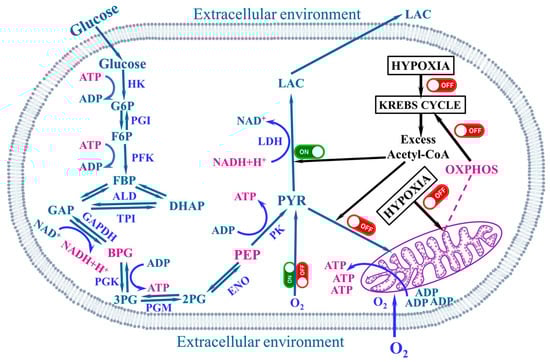 Schematic presentation of the biochemical process of spontaneous transition from ATP formation by respiration (OXPHOS) to ATP production by glycolysis, depending on oxygen availability. Here: G6P-glucose-6-phosphate, F6P-fructose-6-phosphate, FBP-fructose-1,6-bisphosphate, GAP-glcyceraldehyde-3-phosphate, DHAP-dihydroxyacetone phosphate, BPG-1,3 bisphosphoglycerate, 3PG-3-phosphoglycerate, 2PG-2-phosphoglycerate, PEP-phosphoenolpyruvate, PYR—pyruvate, Lac—lactate, HK—hexokinase, PGI—phosphoglucoisomerase, PFK—phosphofructokinase, ALD—aldolase, TPI—triosephosphoisomerase, GAPDH—glyceraldehyde-phosphate dehydrogenase, PGK—phosphoglycerate kinase, PGM—phosphoglycerate mutase, ENO—enolase, PK—pyruvate kinase, LDH—lactate dehydrogenase, O2—molecular oxygen, ADP—adenosine diphosphate, ATP—adenosine 5′-triphosphate, OXPHOS—oxidative phosphorylation, PDH—pyruvate dehydrogenase.